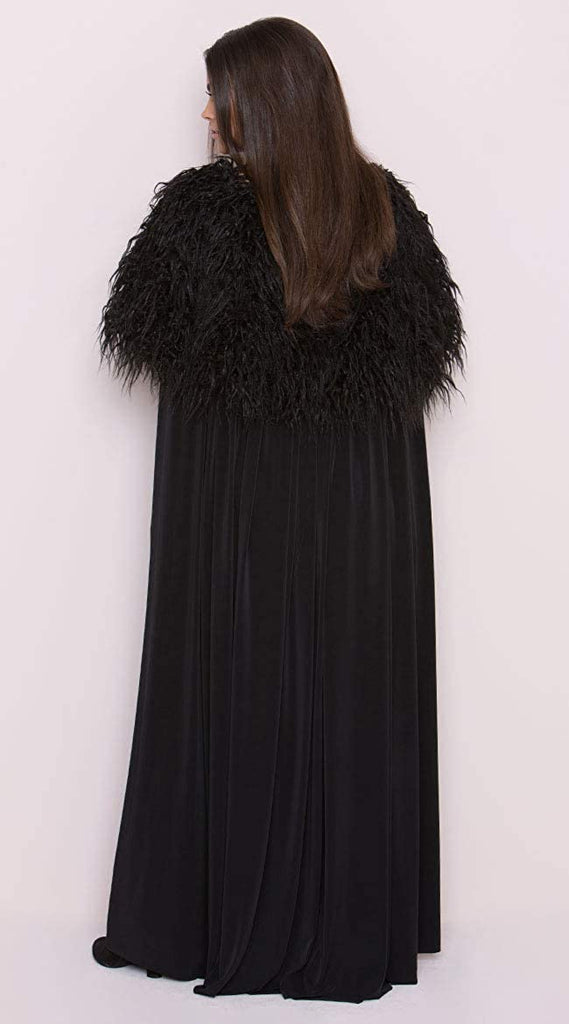 Exclusive Sexy Northern Queen costume featuring a black romper with a high neckline, gold stud accents, a cut-out bodice panel, draping panels with studded accents, an adjustable waist belt with a bronze buckle, a cheeky cut back, and a long black cloak with a faux fur trim and a criss-cross tie closure